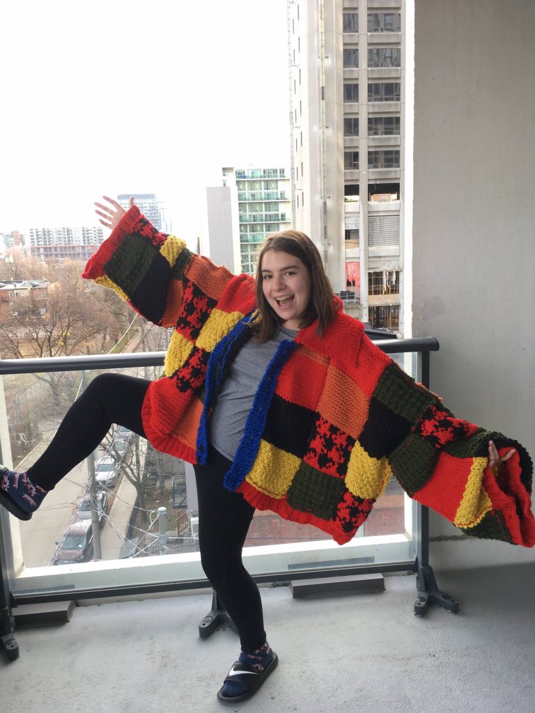Me wearing the (image file) JW Anderson Harry Styles sweater (external link) I knitted!