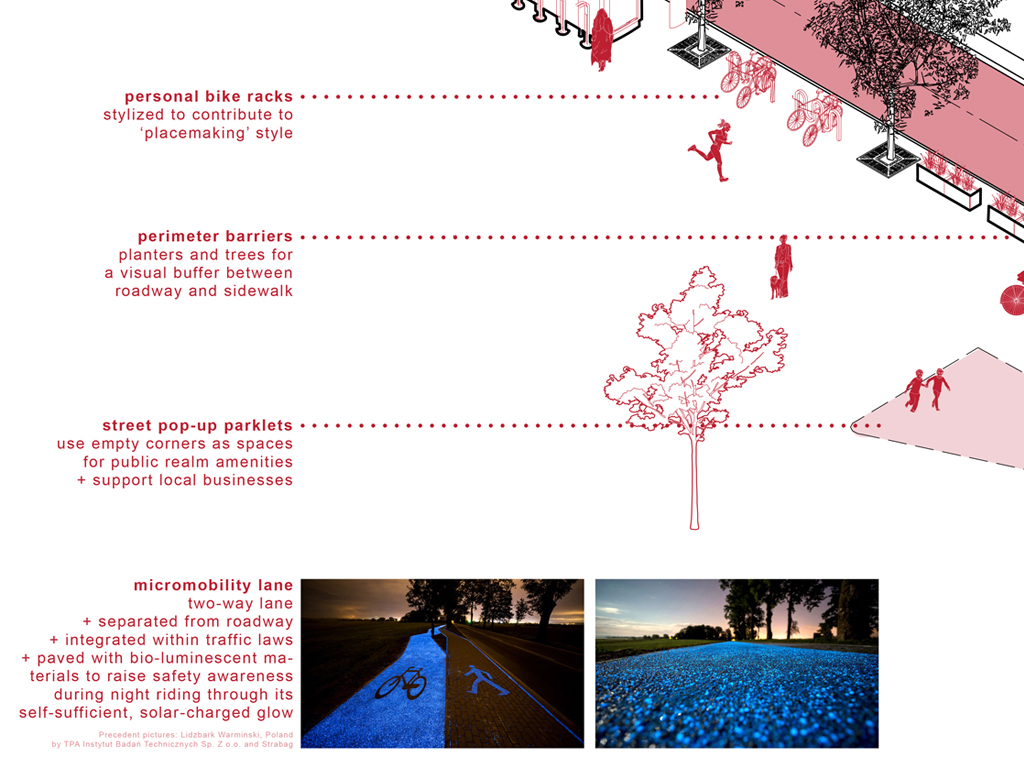 Marwa: The fact that we are able to bring the project together through a unifying design concept makes the project stronger: it brings the whole design back into something. We looked at precedents in Amsterdam which focus on micro-mobility, for example: how can we learn from designs and stories in other cities and apply that to American streets while also taking their context and historicity into account?