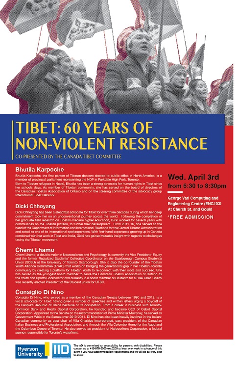 The International Issues Discussion (IID) series at Ryerson University is pleased to present its eighth and final event of the Winter 2019 term: “Tibet: 60 Years of Non-Violent Resistance”, co-presented with the Canada Tibet Committee.