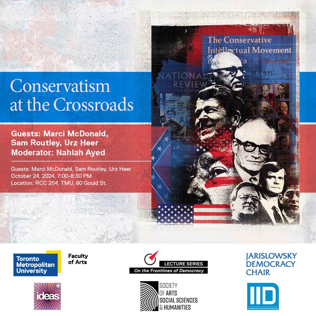 The International Issues Discussion (IID) series at Toronto Metropolitan University is proud to present its third talk of the Fall 2024 series: "Conservatism at the Crossroads", in partnership with On the Frontlines of Democracy, the Jarislowsky Democracy Chair, and CBC Radio Ideas.