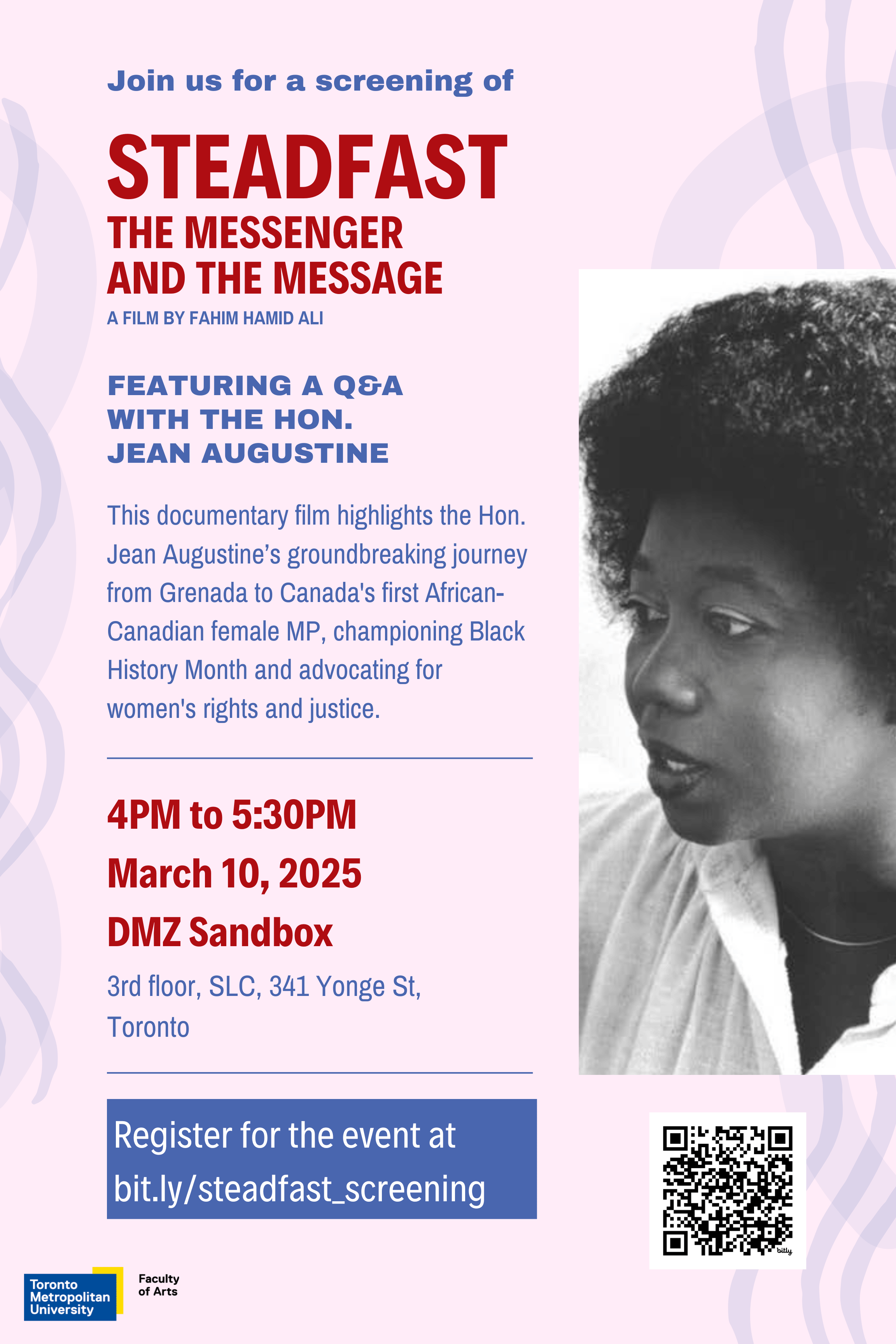 The documentary film tells the remarkable story of The Honourable Dr. Jean Augustine, a trailblazing politician, social justice activist and educator. Directed by Fahim Hamid Ali, "STEADFAST - The Messenger and the Message" chronicles her life journey from Grenada, West Indies to her historic achievement as the first African-Canadian female Member of Parliament and Cabinet Minister elected to Canada's House of Commons in 1993.