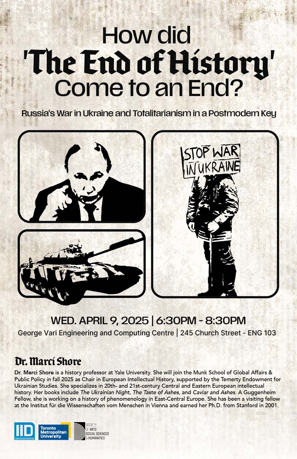 The International Issues Discussion (IID) series at Toronto Metropolitan University is proud to present its fifth and final talk of the Winter 2025 series:"How did 'The End of History' Come to an End? Russia's War in Ukraine and Totalitarianism in a Postmodern Key".