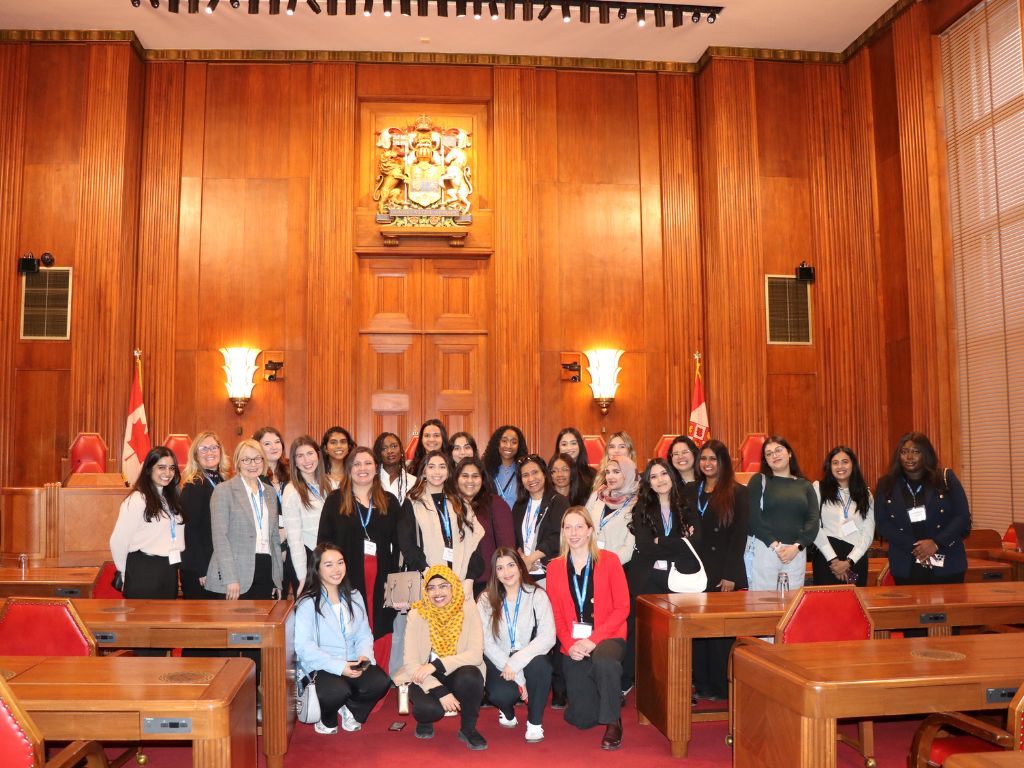 In Toronto Metropolitan University’s one-of-a-kind Women in the House program, housed in the Faculty of Arts, women-identifying and gender diverse students are given the unique opportunity to visit Ottawa, walking the halls of parliament and talking the talk with women leaders who are actively shaping the political landscape. As an experiential learning component of the for-credit course, the trip to Parliament Hill promotes meaningful engagement and invaluable networking with women Members of Parliament, Senators, and staff who are leaders and intersectional policymakers. The trip is made possible with the financial support of AMAPCEO (external link) and Unifor (external link) .