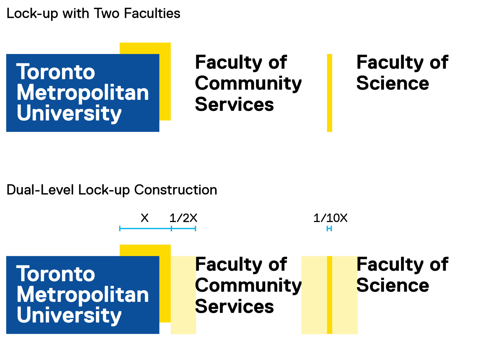University Brand lock-ups position the names of TMU’s closely identified entities in alignment with our gold bar. This shows TMU as a platform for these important brand components.