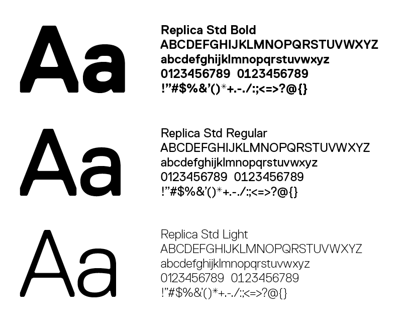 Replica Std Bold and Light are used to differentiate levels of information through contrasting weights. Replica Std Regular can also be used as a third weight. Italics are used sparingly.