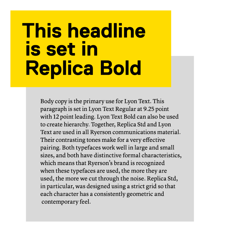 Replica Std is the primary typeface of Toronto Metropolitan University. It is the lead typeface used for headlines in all communications, except in formal or convocational material.