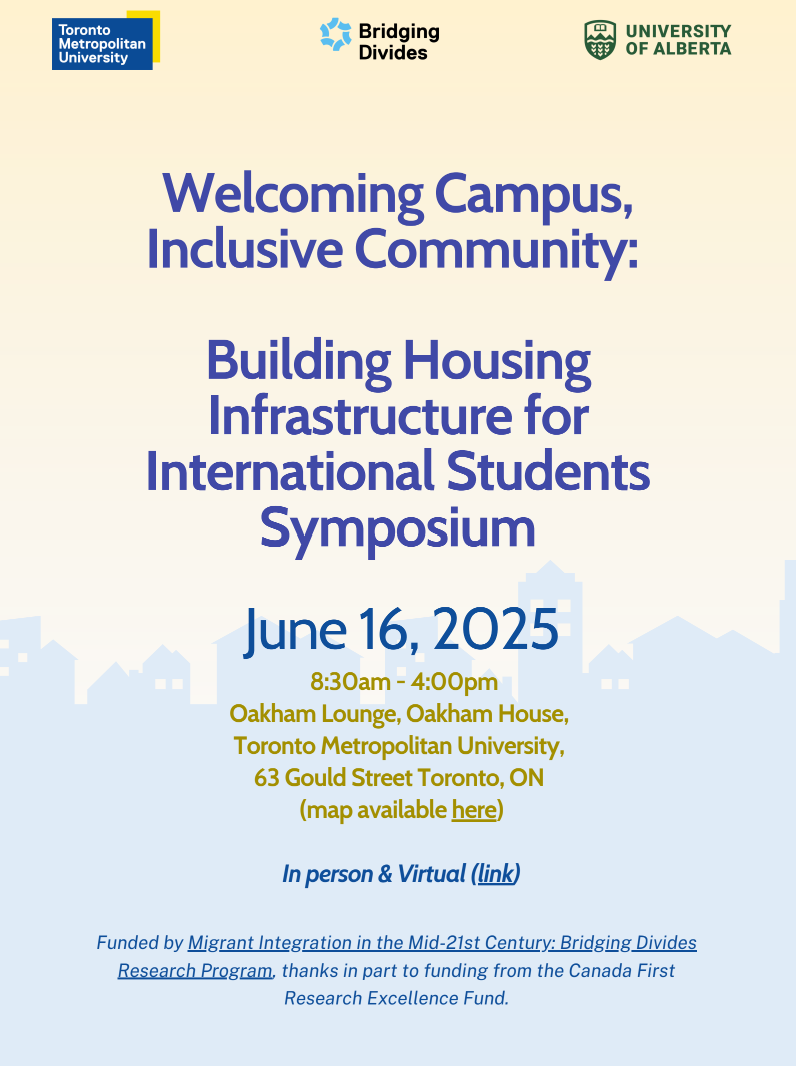As part of the ongoing Bridging Divides Housing for International Students project led by Zhixi Zhuang, this one-day hybrid event brings together a dynamic mix of academics, policymakers, developers, and representatives from multiple sectors to discuss the housing precarity faced by international students in Canada.