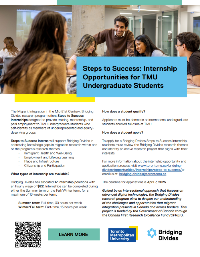 The Bridging Divides research program offers Steps to Success Internships to provide training, mentorship, and paid employment to TMU undergraduate students who self-identify as being part of underrepresented and equity-deserving groups. This in-person work-integrated program offers robust training and mentorship opportunities to help students cultivate essential skills and prepare for professional life.