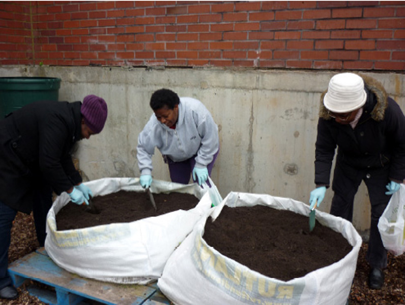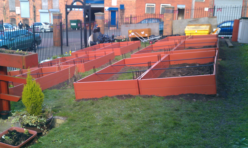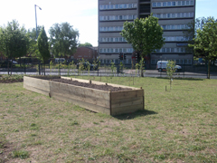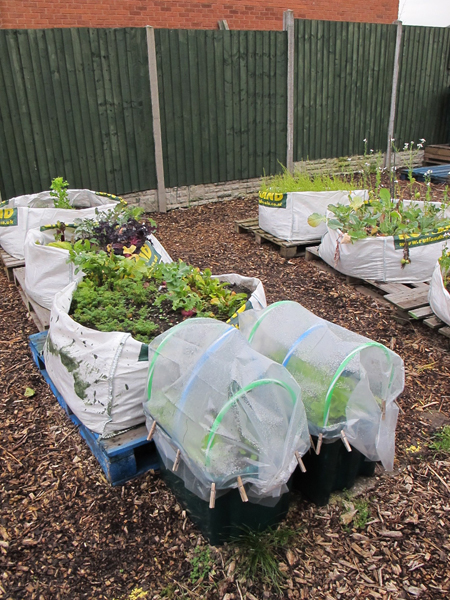 While some GEML sites like Stanhope had long-term prospects, the initiative focused on developing waste land sites for use as growing spaces by local community groups even if that use was temporary. Consequently, a variety of growing means, from bags to raised beds, were applied. At Ventnor Avenue, a block of garages that had fallen into disrepair had become a magnet for antisocial behaviour. Local residents helped remove all the debris and rubbish. Given the hard landscaping of the area, large builder bags resting on pallets (to aid drainage) are used. Approximately six tons of topsoil filled up the grow bags. A training session was provided, concentrating on preparing the soil in the grow bags and teaching the local residents about the diverse types of vegetables and their timetables for seed sowing and planting.