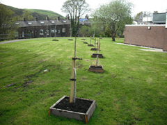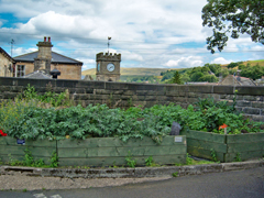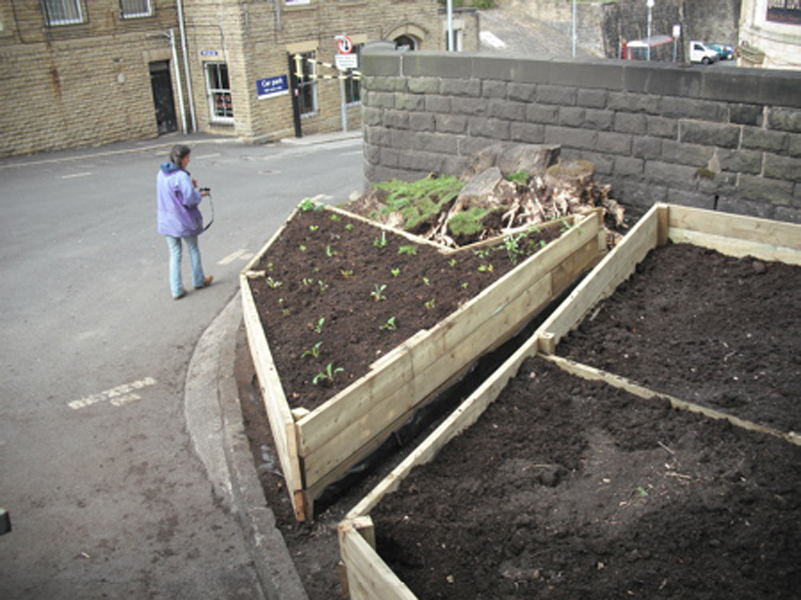 A variety of raised beds have been constructed in the town in order to accommodate the particular needs of vegetable and fruit production in public spaces. This allowed cultivation of fresh produce in uncontaminated soil while simultaneously attempting to keep garden beds tidy. Several of these raised beds have since been adopted by the inhabitants of Todmorden; schools and organisations have joined in and now manage some of the spaces. There are also seven orchards located around the town centre.