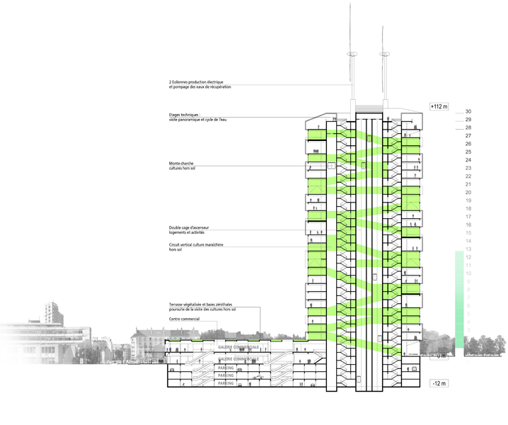 The Laboratoire d’Urbanisme Agricole (LUA – Agricultural Urbanism Lab) was formed in 2012 as a platform for the exchange of ideas around the emerging field of Agricultural Urbanism. It was founded by a number of entities: Paris-based SOA Architectes, Le Sommer Environnement (environmental engineering consultants) and Le Bureau d’Études de Gally (specialists in landscape, plant and agricultural innovation). Many other specialists participated in its founding (including agronomists, sociologists, designers, artists, engineers, etc.). LUA began as a research group formed within SOA Architectes as a result of their work on the Tour Vivante project in 2005. This multi-purpose tower competition proposal for the city of Rennes wove a vertical farm system into residential, office and retail space in a high-rise design.