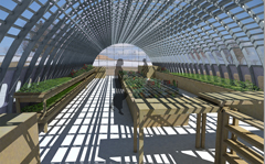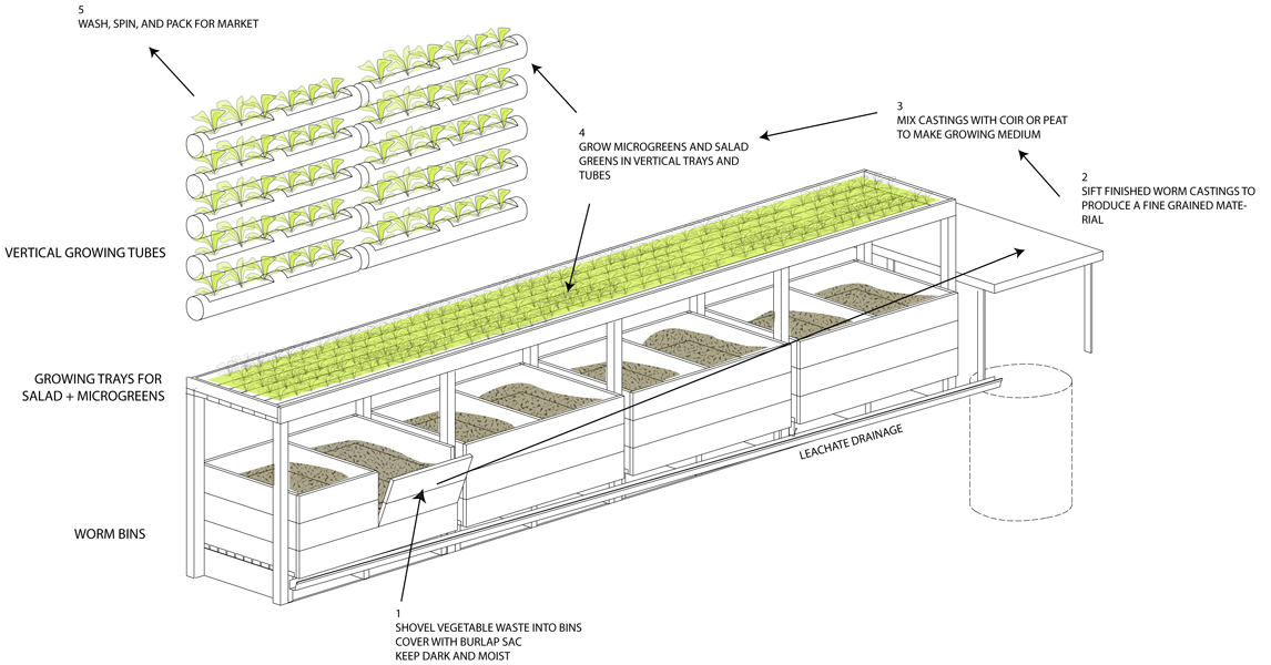 FoodCycles, une nouvelle organisation à but non lucratif qui promouvait le compostage et la production alimentaire tout au long de l’année, a été la première à s’installer sur le site. L’architecte paysagiste Jane Hutton a conçu un projet fondé sur la logique organisationnelle d’une exploitation : les rangées de plantations sont orientées au nord réel afin de réduire au minimum l’ombre des plantes plus hautes sur les plus petites. Les voies de circulation sont disposées de façon à faciliter la récolte des produits; la taille uniformisée des parcelles – à environ do 6 m x 30 m – simplifie le calcul de la quantité de graines à acheter et l’évaluation de la production. En outre de servir à la production alimentaire saisonnière, la serre remplit des autres fonctions. FoodCycles a été remplacé par une autre organisation appelée Fresh City Farms. D’autres groupes, dont Urban Harvest, un petit producteur commercial de graines biologiques et la Coopérative des apiculteurs de l’Ontario se sont également installés sur le site.