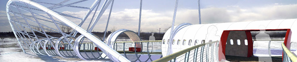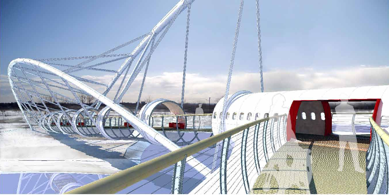 This is part of a master plan for Downsview Park developed by Ryerson students from the Department of Architectural Science. The design focused on the growing, vending, and eating of food within the park setting. This bridge was designed with intermittent sheltered platforms that could be used as picnic shelters. It also serves as a landmark and gateway to the “cultivation campus”, where the 747 Community Greenhouse is located. The entire design was developed around the adaptive reuse of aircraft parts.
