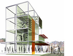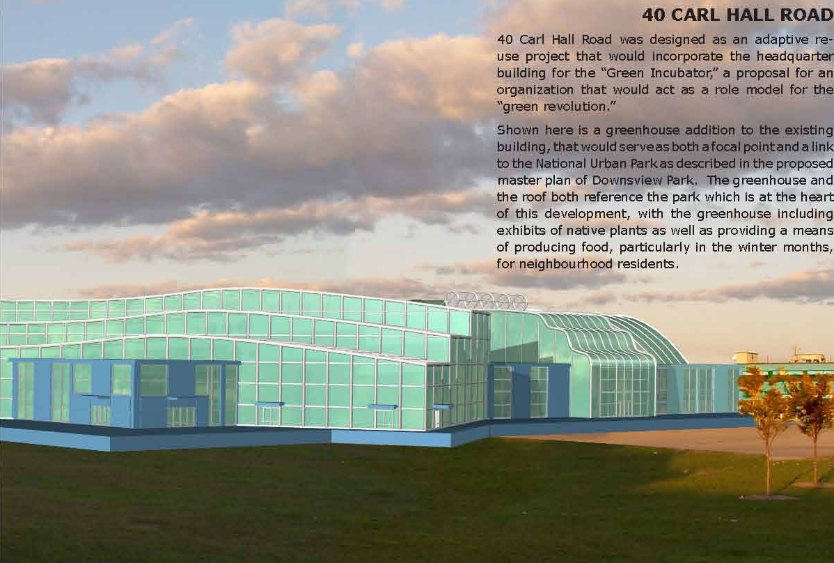 40 Carl Hall Road was designed as an adaptive re-use project that would incorporate the headquarter building for the “Green Incubator,” a proposal for an organization that would act as a role model for the 'green revolution.' Shown here is a greenhouse addition to the existing building, that would serve as both a focal point and a link to the National Urban Park as described in the proposed master plan of Downsview Park. The greenhouse and the roof both reference the park which is at the heart of this development, with the greenhouse including exhibits of native plants as well as providing a means of producing food, particularly in the winter months, for neighbourhood residents.