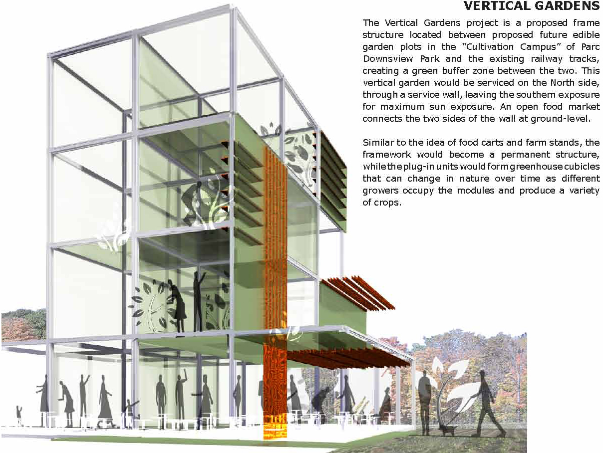 The Vertical Gardens project is a proposed frame structure located between proposed future edible garden plots in the “Cultivation Campus” of Parc Downsview Park and the existing railway tracks, creating a green buffer zone between the two. This vertical garden would be serviced on the North side, through a service wall, leaving the southern exposure for maximum sun exposure. An open food market connects the two sides of the wall at ground-level. Similar to the idea of food carts and farm stands, the framework would become a permanent structure, while the plug-in units would form greenhouse cubicles that can change in nature over time as different growers occupy the modules and produce a variety of crops.