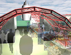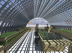 This greenhouse and farmers market complex is intended to be located in the center of the cultivation campus of Parc Downsview Park either as a single building or a grouping of greenhouse/market complex buildings. The building itself is made up of recycled 737 fuselage skeletal structures, strong and light, they are also large enough to accommodate numerous garden plots.