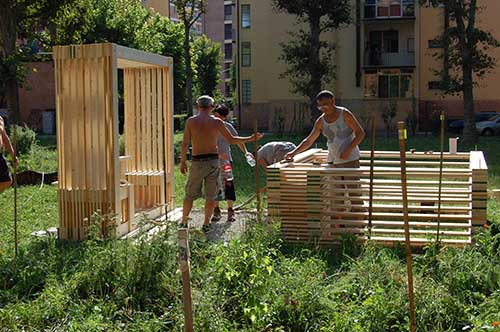 Quadrilatero fuori porta | Il progetto ha riqualificato gli spazi aperti di un comparto di edilizia residenziale pubblica a San Donato, contrastandone il progressivo degrado e i connessi conflitti sociali. L’obiettivo è stato perseguito grazie a un processo partecipativo che ha visto i residenti al lavoro insieme a progettisti, artigiani e funzionari dell’amministrazione comunale. Il progetto ha preso avvio con la festa per la costruzione di un parco aromatico, realizzato con materiale di riciclo; lo spazio è delimitato da vecchi tavoli di cabine elettorali, le aiuole di fiori e aromatiche sono segnate da sassi e mattoni recuperati sul luogo. Questo è stato il primo di una serie di piccoli cantieri diffusi nel comparto, punti di riferimento per le numerose attività che stanno cambiando la natura di questi spazi verdi.