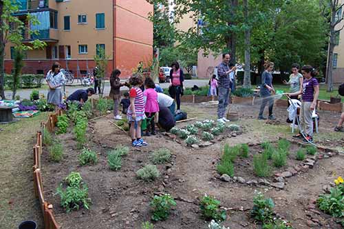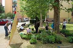 Quadrilatero fuori porta | This project transformed the outdoor spaces of a public housing complex to counter their degradation and the associated increase in social conflicts. This was achieved through a participatory process where residents worked with designers, craftsmen and municipal staff. The process started with an event where an aromatic garden was constructed, using recycled materials; tables made of old voting booths define the space, around beds containing flowers and aromatic plants delimited by stones and bricks recovered on site. This was the first of a series of events that has led to a network of small sites within this complex. These gardens have been the focal point of numerous activities that have changed the nature of these green spaces.