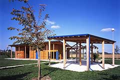 Orti Lunetta Mariotti | This park, open since 2009, promotes social relations while respecting the character of the place (a former military area that was cultivated for decades by elderly from the neighbourhood). The pre-existing trees and biodiversity have been preserved, as the space was integrated into the new system of public green spaces linked to the Navile canal. Five distinct sectors of horticultural parcels were arranged irregularly inside the park, alternating with grassy clearings, groups of trees, play areas and pedestrian paths. Every sector is fenced and marked by a distinctive portal in coloured wood. A new building that includes energy-storing capacity serves as headquarters for the gardeners along with numerous recreational activities for schools, families and neighbours.