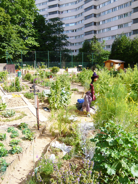 Sur la dalle de béton d’un ancien terrain de basket du 15e arrondissement, la Ville de Paris a créer en 2009 un jardin partagé pour les habitants de ce quartier populaire. Géré par l’association Entr’aides, les 350 m2 de jardin ont été divisés en 50 parcelles de 3,50 m2, disposées en bandes de 2 à 3 mètres de large. Ecoles, maisons de retraite, personnels des hôpitaux, et bien sûr habitants du quartier s’y retrouvent pour jardiner ensemble.