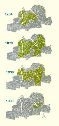Over the centuries, agricultural land around Paris supplied the capital. Production, particularly varied on these fertile lands, was also distributed throughout France. Between the seventeenth and the nineteenth century, horticulturists developed the horticulture of Montreuil, planting peach trees in espalier along plastered walls made from locally-quarried rubble. These walls cleverly constructed and oriented to the sun keep the heat in the plots thus creating a micro-climate for growing fruits that luxury-market gardeners sold at the market for Parisian notables and royalty (from François I to the Tsar of Russia). In addition, in 1880, peach orchards covered 400 hectares or nearly half the town and produced 17 million fruit. In the early twentieth century, with the development of the railway, peaches were brought earlier in the season from the south, lead to the decline of this growing area. 2.50 m high, parallel and spaced 10 m apart, the walls have structured the landscape imprinting the city with their framework still visible today.