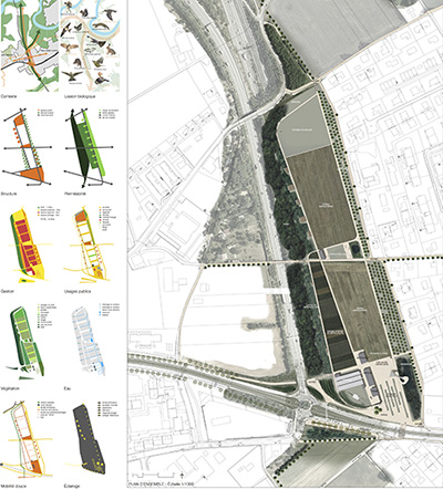 At the end of 2012, a design competition launched by the Canton of Geneva and the Swiss Republic solicited development ideas for nine hectares of land that link together three towns within Geneva’s metropolitan area: Confignon, Bernex and Onex. The designers were asked to propose uses for the green space, serving as an “agro-urban park” that establishes a zone for urban agriculture as well as providing spaces for leisure and recreation. The design is part of a larger vision for the future, intended to incorporate two boulevards with residential neighbourhoods and public transportation. The participants were challenged by a need to maintain the heritage of the region’s agricultural past by integrating a farm into the landscape. In addition, the presence of a noisy highway adjacent to the site and a major road that crossed the site had to be negotiated. Spatial quality, functionality and feasibility were essential concerns of the jury.