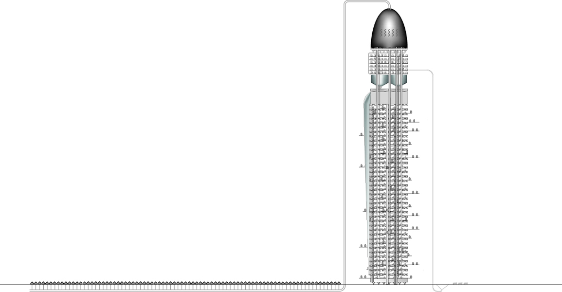 Pig City proposes 44 Pig Towers which would produce enough pork to maintain the present export levels from The Netherlands. These towers would take up just over 5 percent of Dutch land area, when taking the surrounding reed fields into account. To minimise transportation, the towers would be positioned near a harbor.