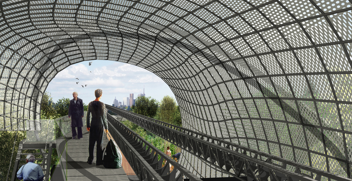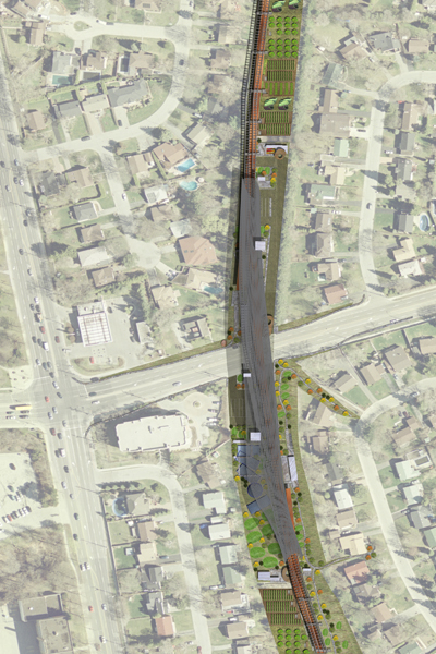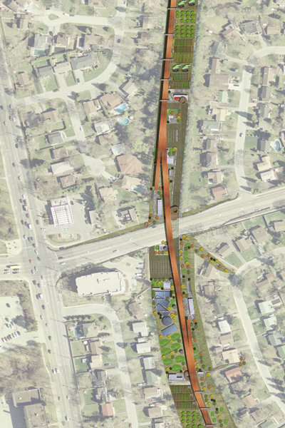 This project focuses on the points of intersection between the corridor and the major streets, specifically the intersection at Lawrence Avenue. At this point, one can access an elevated bicycle/small vehicle roadway, a rail-based transit network and a local road serving the allotment gardens. These systems are thoughtfully integrated into the linear park and the existing suburban fabric in order to foster social interactions and spontaneous events.