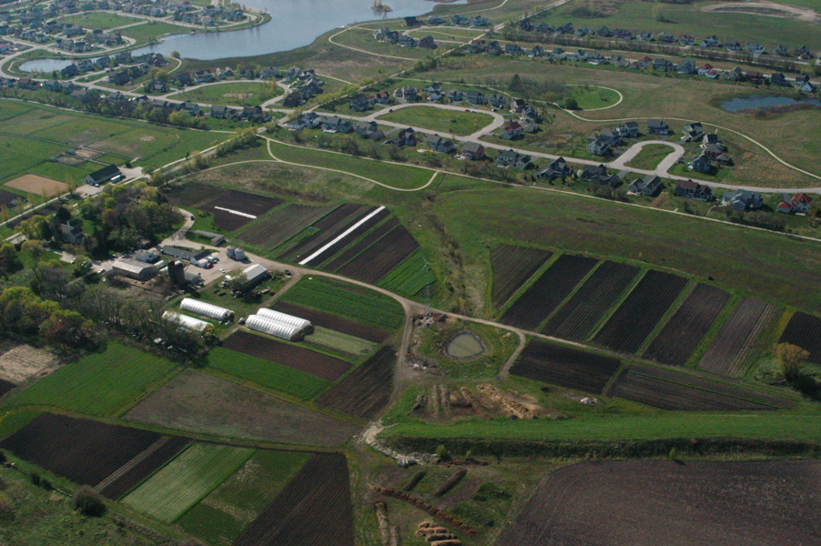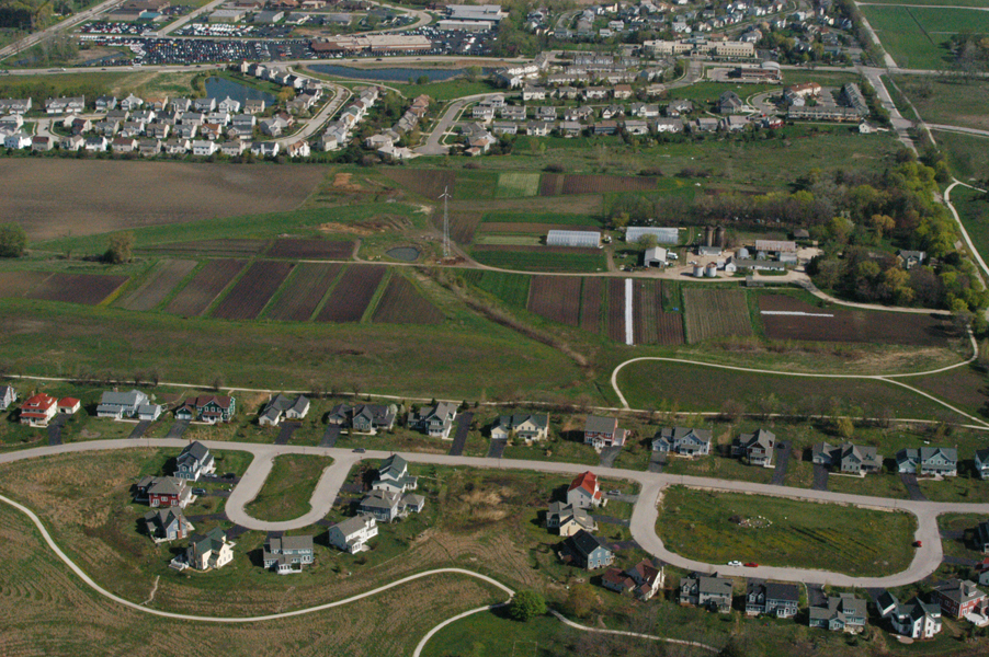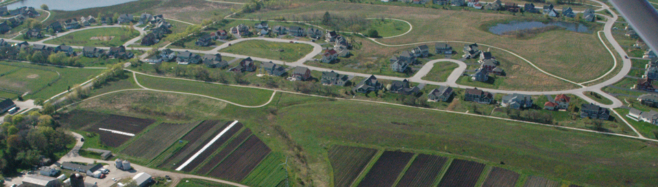 From the start Prairie Holdings Corporation was strongly committed to incorporating cultivation of organic food production into the project. To protect the farmland in perpetuity, a permanent conservation easement has been placed on the land, held by The Conservation Fund, which requires it to remain undeveloped. The site also includes a 5-acre “Learning Farm” that provides work experience on the farm for children of two local schools, and integrates agriculture, environment and community issues into the curriculum. Prairie Crossing demonstrates that locally focused agriculture can be integrated into residential development for the benefit of both. It demonstrates a financially profitable model for farmers who are willing to serve local needs, and helps to build a more localized economic base, re-circulating local income within the community.