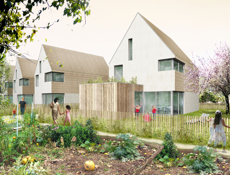 Le plan masse retenu par les architectes, favorisant les orientations nord-sud des logements, permet également de maintenir des percées visuelles vers le coeur d’îlot, aménagé en jardins potagers individuels et un jardin partagé commun, et de maintenir un lien visuel à avec la forêt voisine de l’opération. Pour favoriser une appropriation des espaces extérieurs et le vivre ensemble au sein de la copropriété, l’autogestion d’un jardin participatif par les copropriétaires est proposée. Ainsi, ce projet renouvèle des principes vieux d’un siècle dans le domaine du jardins comme dans celui de l’habitat.