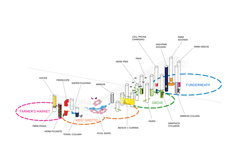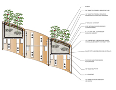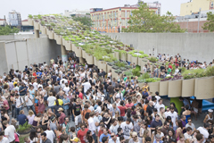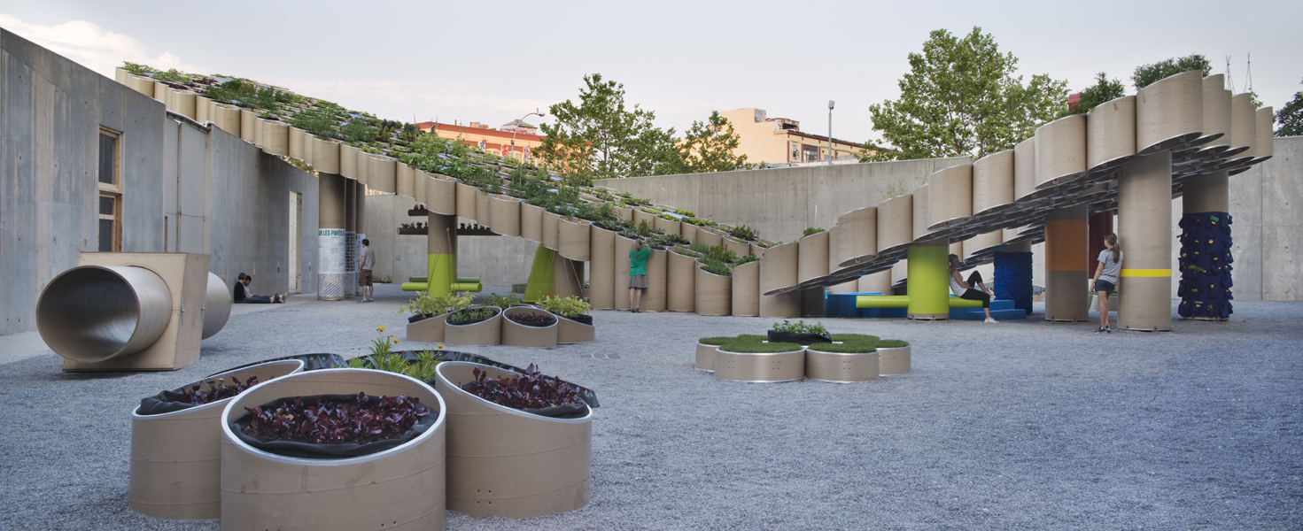 Each cardboard column was programmed to create a different zone around it and generate a variety of experiences and interactions under the farm such as a solar-powered juicer for fresh vegetable cocktails, a dried herb column, a periscope that provided close-up views of the fields, and a water fountain. The “Grove”, a gathering of columns, featured tubes for seating and growing herbs. The “Funderneath” was an experiential zone using video and sound to simulate the rural experience. The PS1 café was provided with fresh, organically grown and extremely local fruits and vegetables from the container gardens in the courtyard.