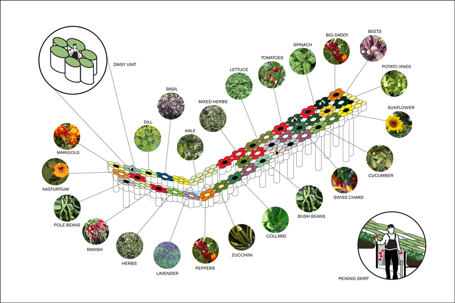 Les concepteurs de WORKac voulaient employer un matériau structural recyclable et biodégradable et avaient choisi comme matériau de base des tubes de carton qui servent habituellement d’éléments de construction pour le coffrage. Les segments de tube étaient assemblés suivant un schéma en nid d’abeille, créant ainsi un champ de quarante « marguerites » - des groupements de sept tubes organisés en unités structurées. À l’intérieur de la grille de marguerites, certains tubes descendant jusqu’au sol comme des colonnes servaient à soutenir la structure. Sous la ferme, différentes expériences et interactions étaient prévues autour de chaque colonne de carton,– il y avait, par exemple, un pressoir à énergie solaire pour faire des cocktails de légumes frais, une colonne d’herbe séchée, un périscope qui offrait des gros plans sur les champs, et une fontaine à eau. Le « bosquet », un groupe de colonnes, présentait des tubes pour s’asseoir et cultiver des herbes. À travers l’utilisation de la vidéo et du son, la zone du « Funderneath » simulait l’expérience de la campagne. Quant au café du Centre d’art PS1, il était fourni en fruits et légumes frais, bio, et tout à fait locaux puisque provenant des jardins en récipients dans la cour.