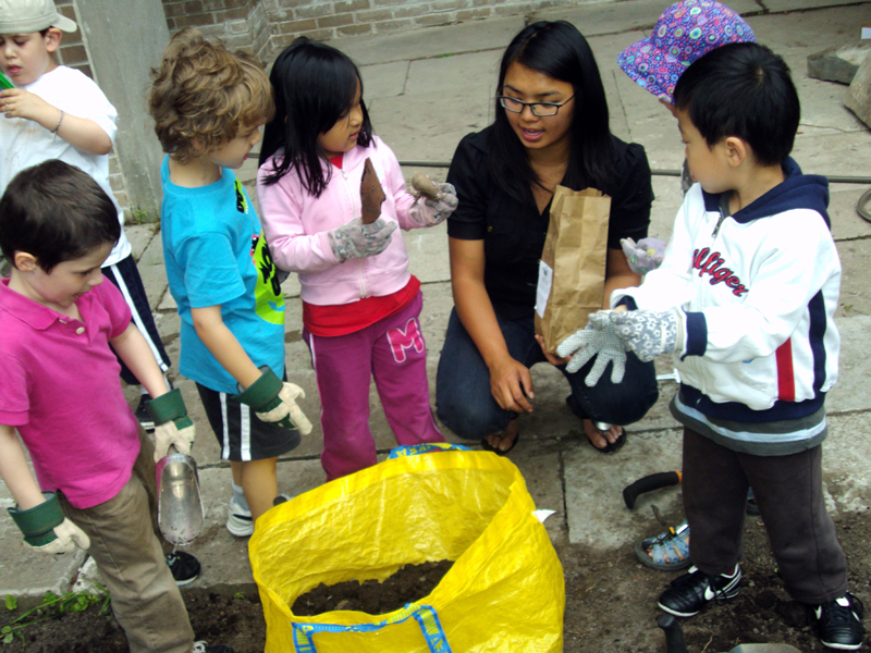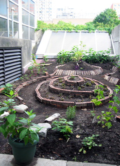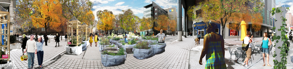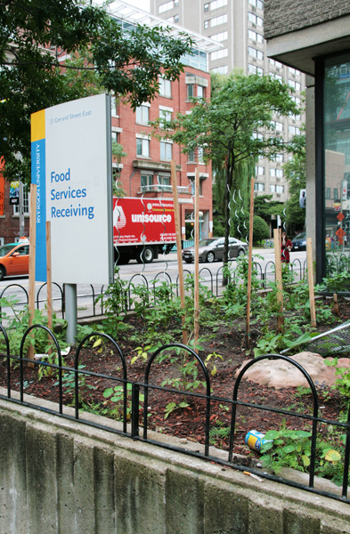 The initial concept was to place moveable planters in the middle of Gould Street, a newly pedestrianized section of street running through the heart of the Ryerson campus. Consultations with the campus planning officials came to the conclusion that this would not be possible, due to construction that was scheduled to continue throughout the summer. Instead, a patch of south-facing garden beside the street was offered to the team as a site for the garden. 3 additional, underused sites around campus were also eventually agreed upon.