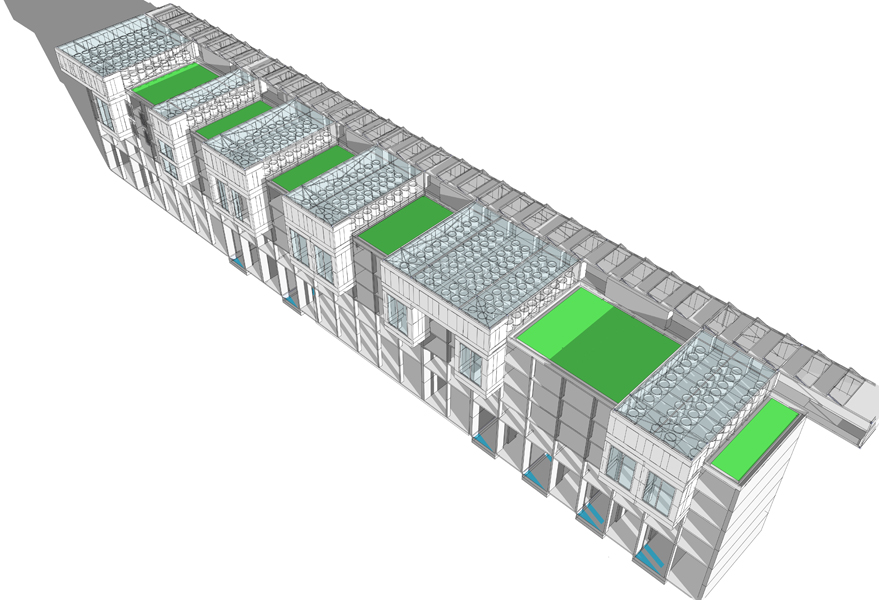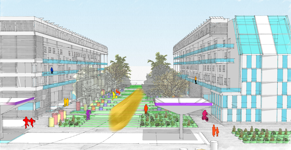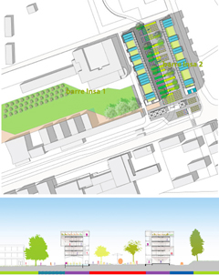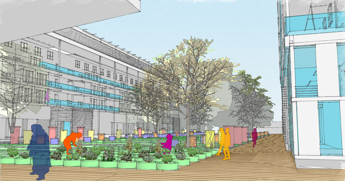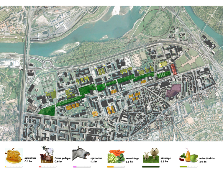 Following the course of a linear park, this project would incorporate fruit and vegetable production on campus, based on a cooperative model for production and resale. The activities envisaged include: vegetable crops, fruit trees, grazing, beekeeping, a learning farm and horseback riding. Production would be organized spatially on different usable surfaces (ground, roofs, solid facades), each one associated with a type of production. The area of land along the linear park of 6.6 hectares would focus on various types of fruit production. The roof area would be assigned to vegetable growing in greenhouses, utilising an unused area, providing better exposure to the sun, while revitalizing the urban landscape. The use of solid facades would enable a separate access to roofs, where small-scale forms of production would be applied, such as for medicinal plants or greenhouses for seedlings. Finally, in some locations, micro-gardens based on soilless cultivation would be developed on hard surfaces within the campus to promote a social bond between people.