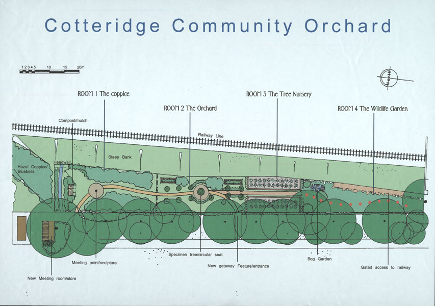 Cotteridge Park is located south of Birmingham’s city centre, close to Bournville, the site of the famous Cadbury chocolate factory. In 1997, the Friends of Cotteridge Park (FoCP) group was formed to save the park from funding cuts by the city authority. Through a series of high-profile protests, FoCP was able to convince the authority to not decommission the park. Following this victory, FoCP continued its work with the park focusing its efforts on improving the existing facilities, and creating new ones. One of these improvements included creating a community orchard for local residents on a large patch of derelict land owned by British Rail which ran up the outer edge of the park.