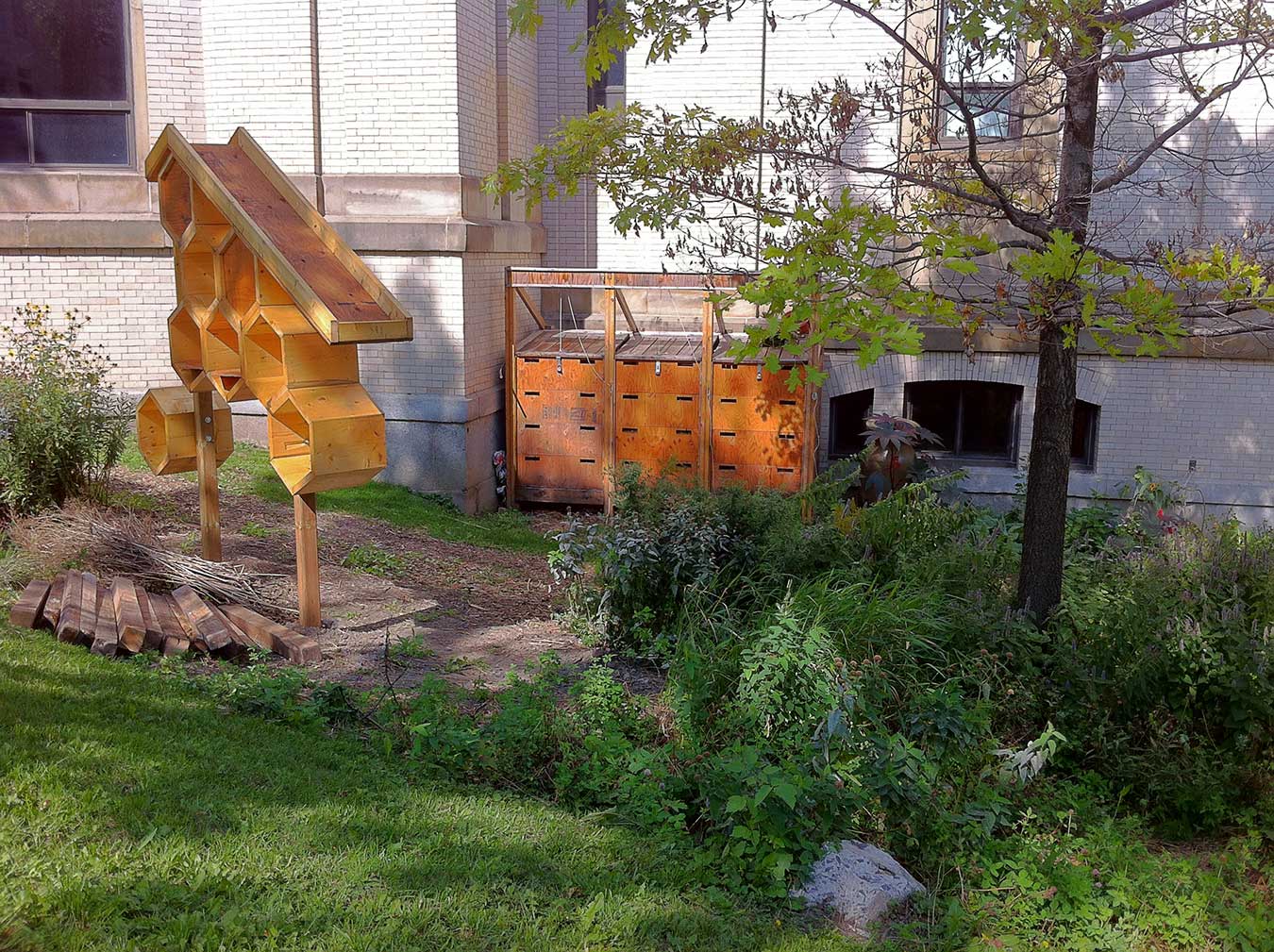 - Three beehives to produce honey while pollinating the gardens on and off campus