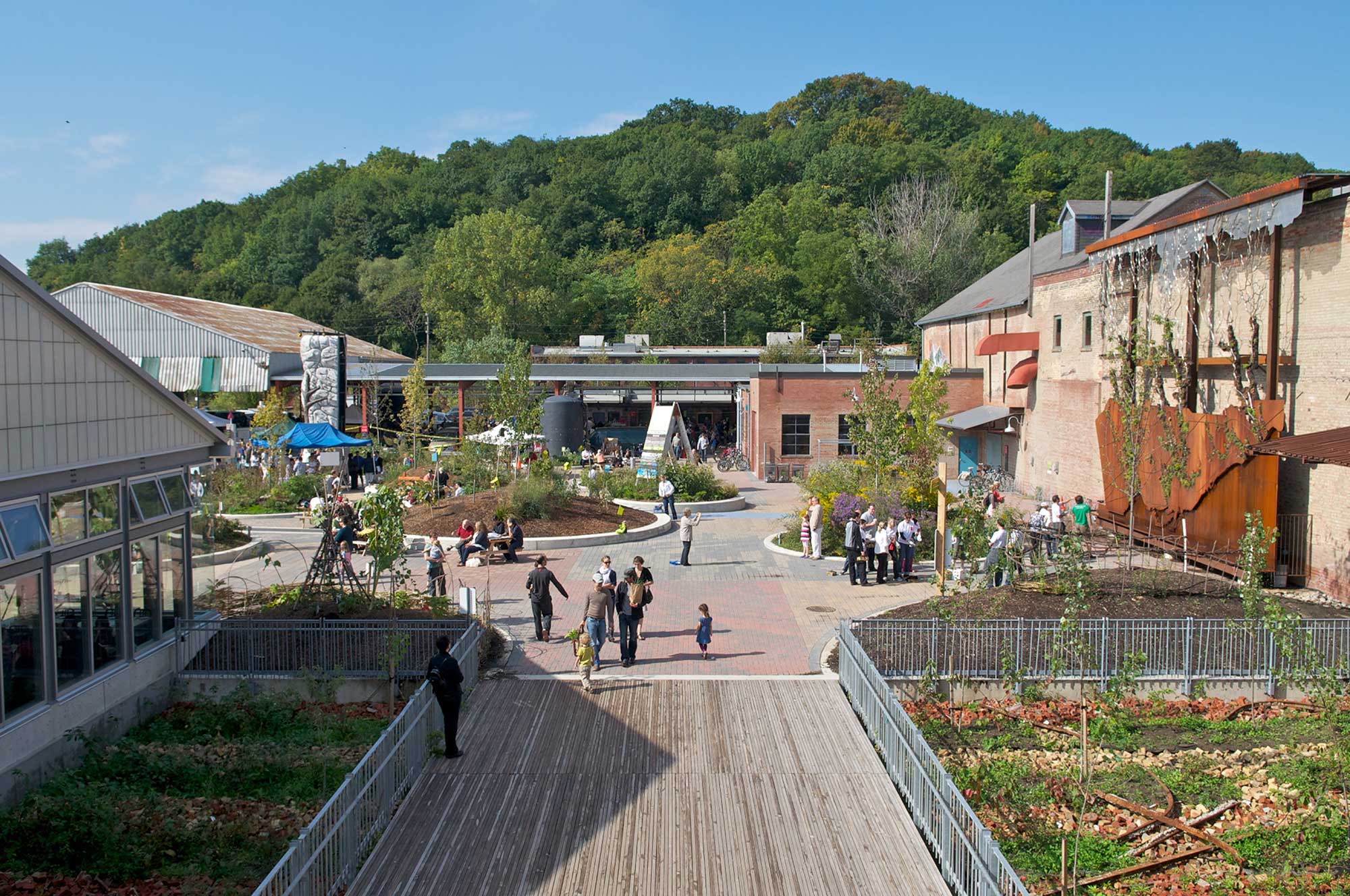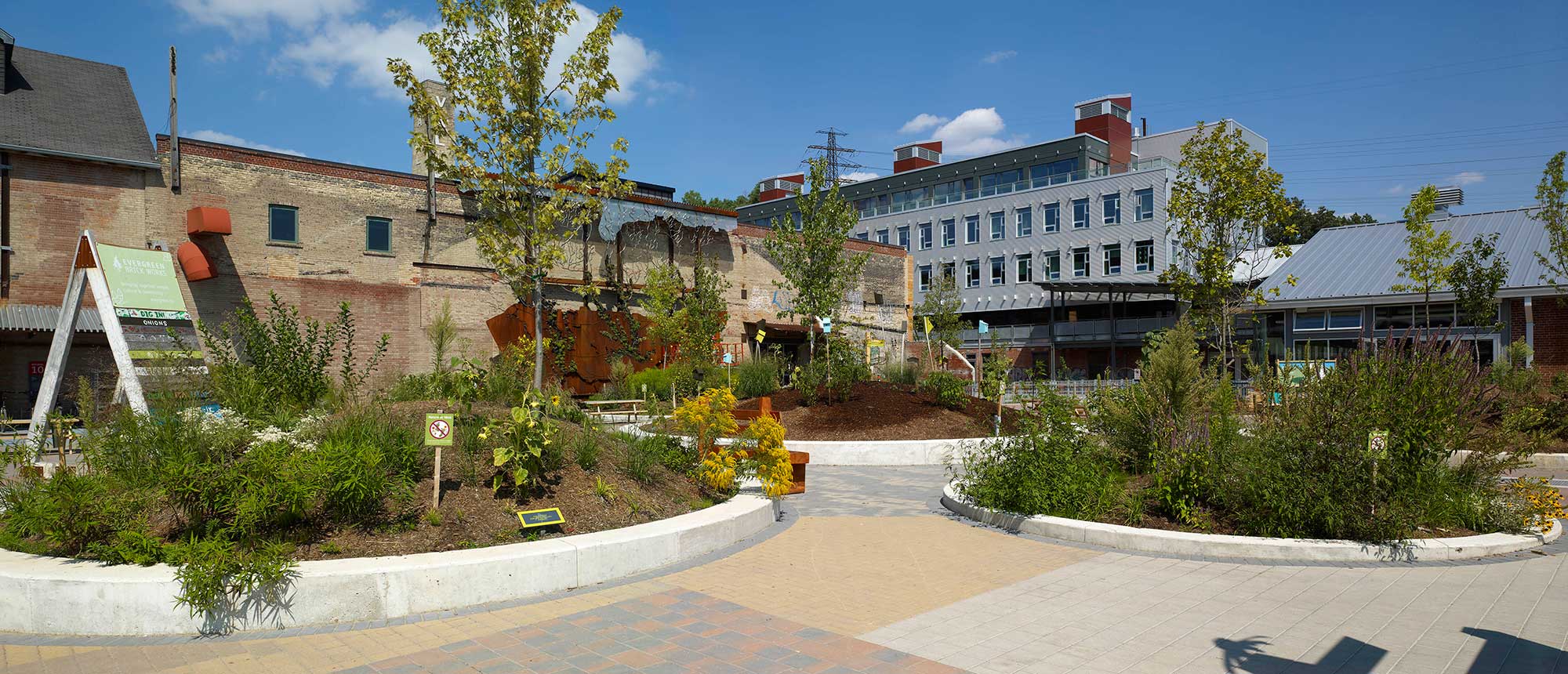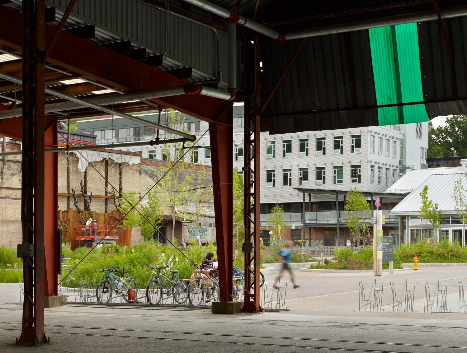 Fundamental to the site design is the connection between the built environment and nature, demonstrated through the design of porous transitions between landscape and architecture to allow flows of storm water, native habitats and plantings to pass through the site, integrating high-tech and low-tech sustainable technologies. This project integrated urban agriculture from its inception as one of the core means for community engagement, education, and recreation, as well as a way to promote healthy eating and a healthy lifestyle. Together with the farmers’ market and other healthy initiatives, the Brick Works urban agriculture and food initiatives promote health, increase food security, and bring people together.
