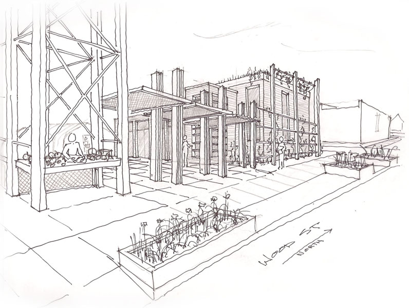 Au cours de l’été 2008, trois serres à arceaux ont été construites pour permettre la culture d’aliments tout au long de l’année. Du fait de son expansion, la ferme urbaine ne pouvait fonctionner de façon optimale sans installations supplémentaires. SHED Studio a donc travaillé avec « Growing Home » pour identifier précisément les besoins auxquels la nouvelle construction devait répondre. La deuxième phase du projet a engagé la construction d’un bâtiment polyvalent comprenant une serre permanente, un espace de transformation et d’entreposage, mais aussi des bureaux et des salles de réunions. L’aménagement paysager a été un aspect important pour embellir le quartier et rendre le site agréable à la communauté. Un mur vivant, des bacs à fleurs et un lieu de vente de produits fermiers ont été créés, ainsi qu’une « clôture comestible » d’arbres et arbustes fruitiers. La phase finale du projet prévoit d’inclure des éléments verts : des panneaux solaires et une « tour d’énergie » avec des panneaux photovoltaïques ou une éolienne fourniront le site en énergie ; un toit végétalisé isolera le bâtiment. La Ferme urbaine de Wood Street produit aujourd’hui plus de 4,5 tonnes par an et prévoit de vendre la moitié de sa production au sein de la communauté d’Engelwood.