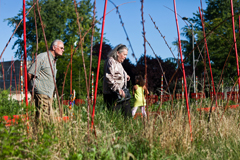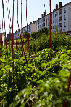 In Lyon, a particular interest by sculptor Céline Dodelin and Landscape Architect François Wattelier in derelict urban spaces led to the creation of the Atelier des Friches (Brownfield Studio), an “ecocitizen’s association”. Choosing an abandoned site at the heart of the Gerland housing estate as the epicentre of their activities in the neighbourhood, they named it La Réserve and divided it into three parts: one for nature, one for vegetables, and one for artistic pursuits. Originally squatters on this site, the Atelier des Friches eventually signed a property agreement with the City of Lyon in 2010. The knowledge that the use of the site was conditional helped inform the choice of crops used at the Jardin Gerland. A distinctive visual language, notably the use of bright red paint on planters and metal structures dispersed around the site, gives the project a clear identity.