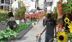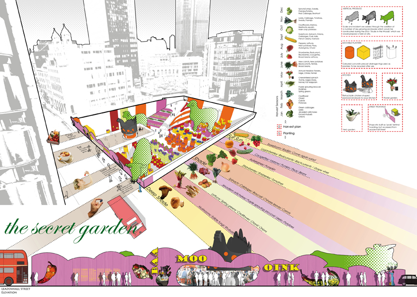 The proposal aims to provide public open space in three distinct growing areas designed around the climatic conditions imposed by the surrounding buildings. Fruiting vegetables, soft fruits, herbs and root vegetables that need the most sunlight are located in the sunny northern part of the site. Leafy, green crops such as cabbages, broccoli and spinach that can cope with partially shaded conditions occupy the central part of the site. The southern part is in deep shade from adjacent buildings so here, a log forest of exotic mushrooms interspersed with shade-tolerant crops such as rhubarb and mint is proposed. City workers can escape to lunch among the shade, while children can learn about food sources and food preparation processes. The proposal enlivens the public face of the Leadenhall Street frontage by a series of pods behind expressive hoardings that house food outlets selling fresh produce grown on site and prepared meals with local ingredients.