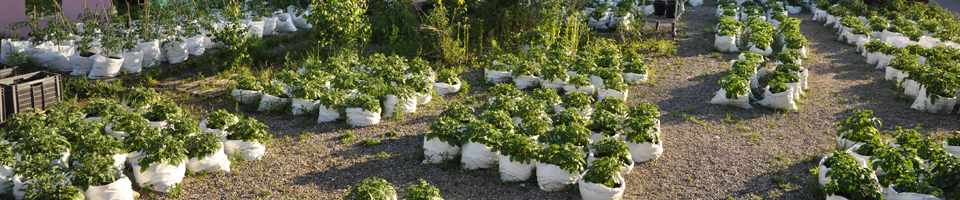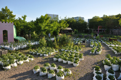 Today, a range of about 500 different crops are grown with special attention given to heirloom and rare varieties. To make the operation mobile and to adapt to the site (a brownfield where food could not be grown in the ground), a wide variety of recycled food crates and other containers are used as planters. There are approximately 2700 stackable containers, 400 rice bags and 250 Tetra-Paks in use in various combinations, producing as much as 4000 kg of produce in one year.