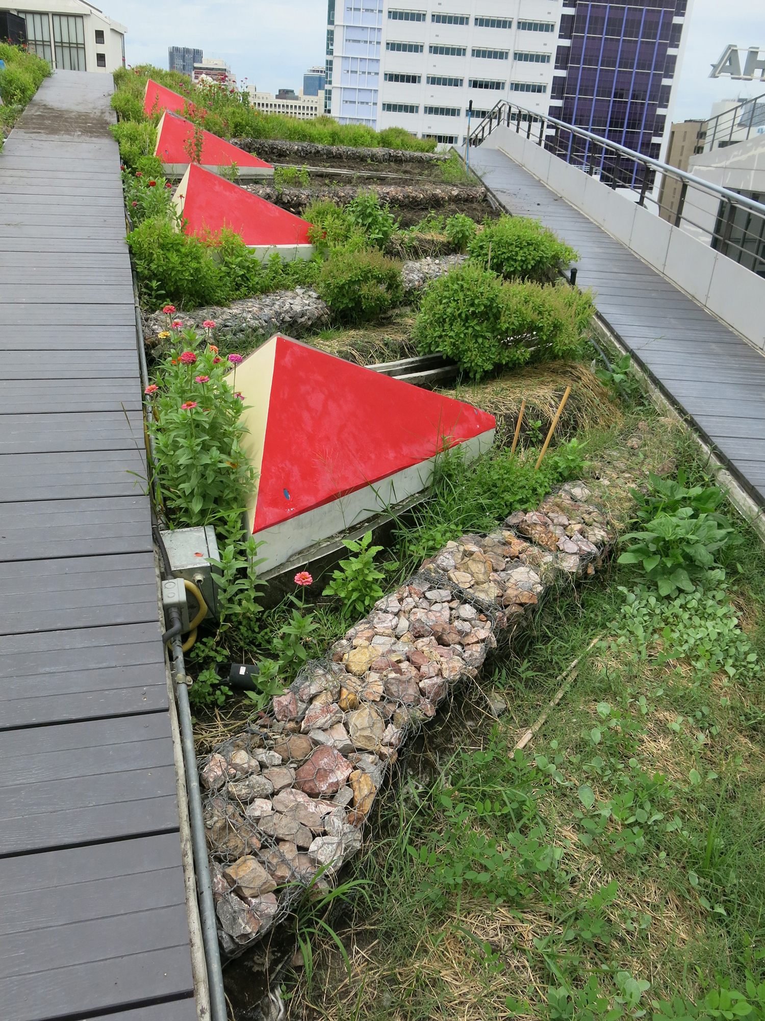 SGS also creates renewable energy from solar panels, and has a major water catchment system, helping slow the water flow in times of heavy downpour, enhancing the drainage efficiency of the area. At the same time, it reduces the heat inside the building by 3-4 °C as well as the outside temperature in the garden area by as much as 7 °C.