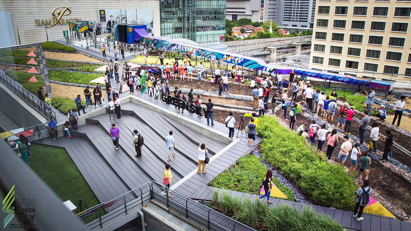 En mars 2015, l’Université Chulalongkorn a mis en place un centre d’apprentissage agricole en milieu urbain nommé Siam Green Sky (SGS) sur le toit du Centre Commercial Siam Square One, situé dans l’un des carrefours les plus animés de Bangkok. L’investissement initial pour l’installation du toit-potager s’élevait à environ 161700 US$. Couvrant une surface de 2000 m2, cela en fait probablement la toiture jardin la plus vaste de Thaïlande. Etudiants ou simples visiteurs se voient offrir gratuitement une possibilité d’apprentissage agricole mettant l’accent sur la diffusion d’une agriculture innovante, l’aménagement paysager, l’art, l’écologie urbaine, et sur des procédés de production alimentaire sûrs. De par sa conception, SGS est basé sur trois principes fondamentaux: création d’un centre d’apprentissage, sensibilisation agricole et réseautage social. Il cherche à reproduire au cœur de la ville le mode de vie des agriculteurs thaïlandais afin de permettre la transmission de leurs savoir-faire et méthodes de travail aux citadins.