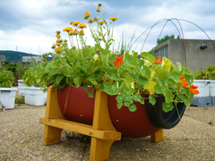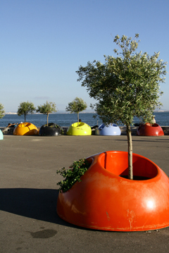 Many rigid containers are not created originally as planters, they are simply reused vessels intended for other purposes. Old tires, baths, buckets, children’s wading pools, pipes have all been used to create interesting planters. The options for reuse of materials are limited only by the inventiveness of the gardener or designer. Some rigid containers are freestanding sculptural structures, others are integrated with seats or other landscape elements. The colourful, moulded-plastic planters that support herbs and olive trees at Lisbon’s Cais do Sodré, designed by the artist Leonel Moura, are an example.