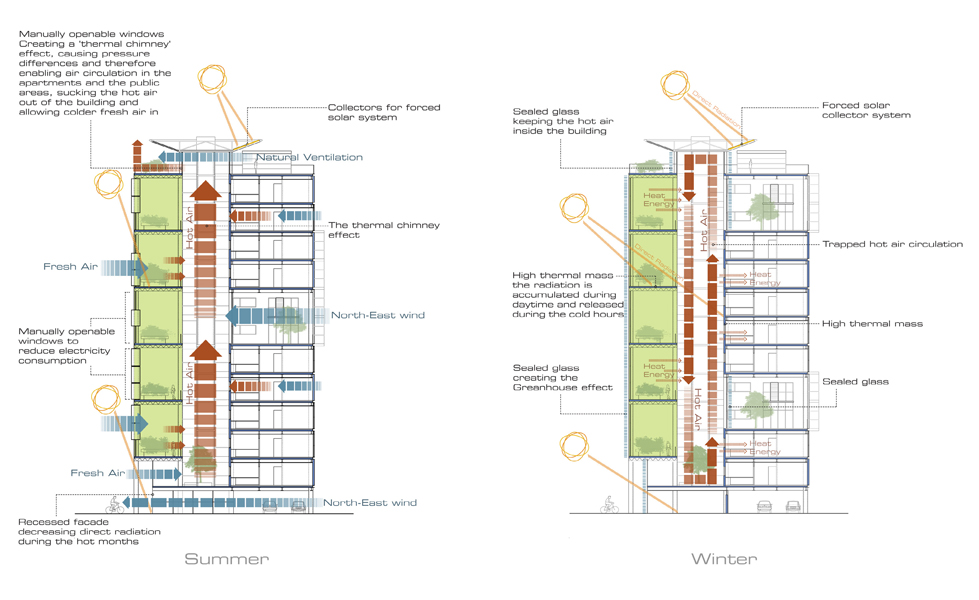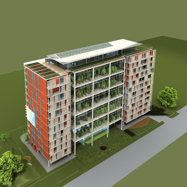 The proposed building includes a variety of community and semi-private spaces intended to create a sense of place and provide amenity within a high-density residential block. They include a ground-floor level kindergarten, a rooftop club and green space for gathering and celebration, and a large, central, multi-storey greenhouse. The project embraces many green building practices to reduce its environmental footprint, including grey water re-use, a ground-source heat pump system, and passive heating and ventilation through the south-facing greenhouse space. The structure and materials were selected for easy erection, dismantling and recycling as well as economy.