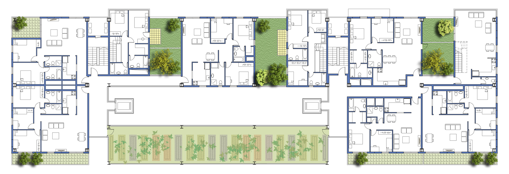 Le projet d’immeuble comprend différents espaces communautaires et semi-privés qui visent à créer un sentiment d’identité et des lieux agréables dans un immeuble densément peuplé. Il y a ainsi une école maternelle au rez-de-chaussée, un club et un espace vert sur le toit où se rencontrer ou organiser des fêtes ; au centre du bâtiment, une grande serre s’élève sur plusieurs étages.