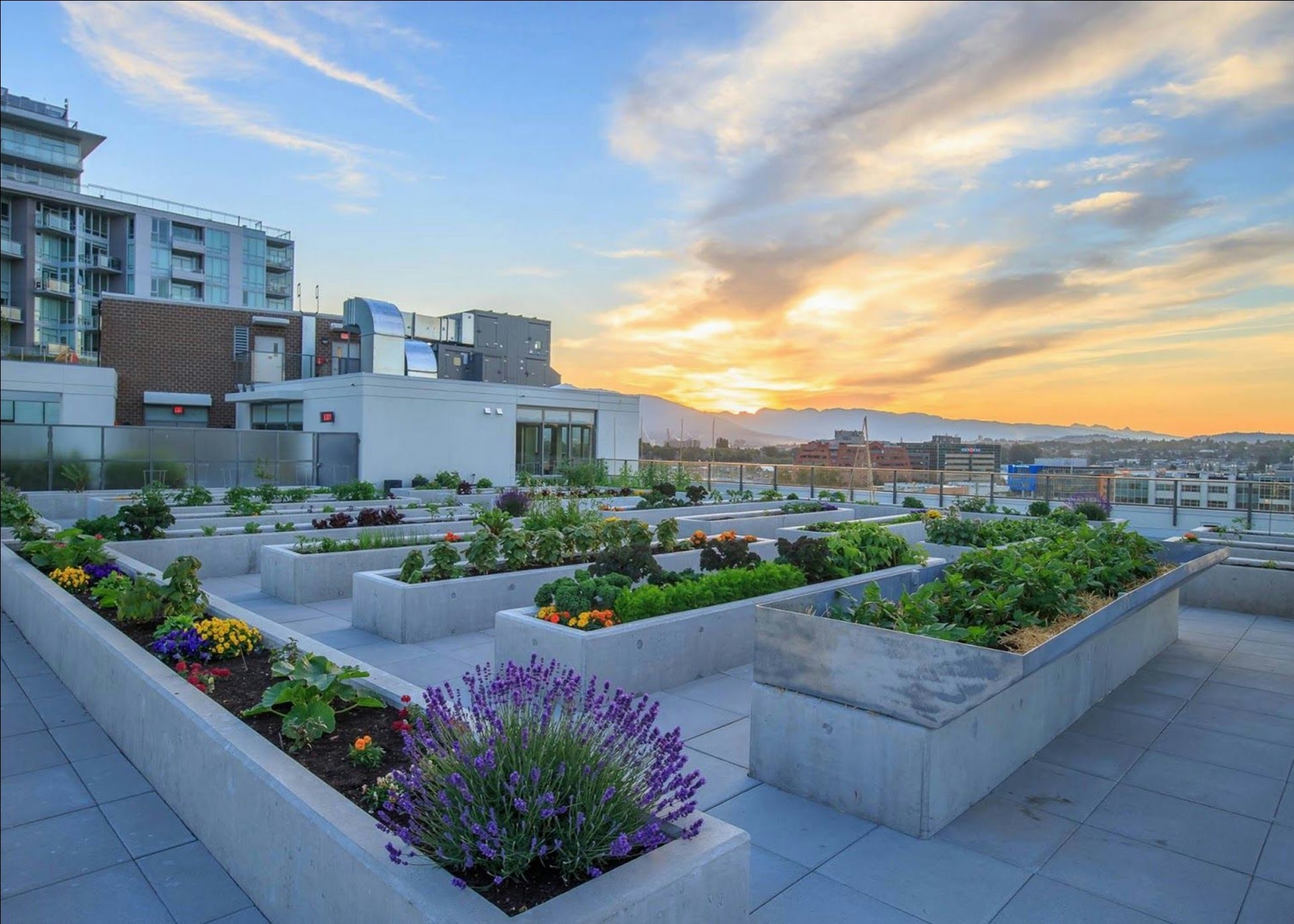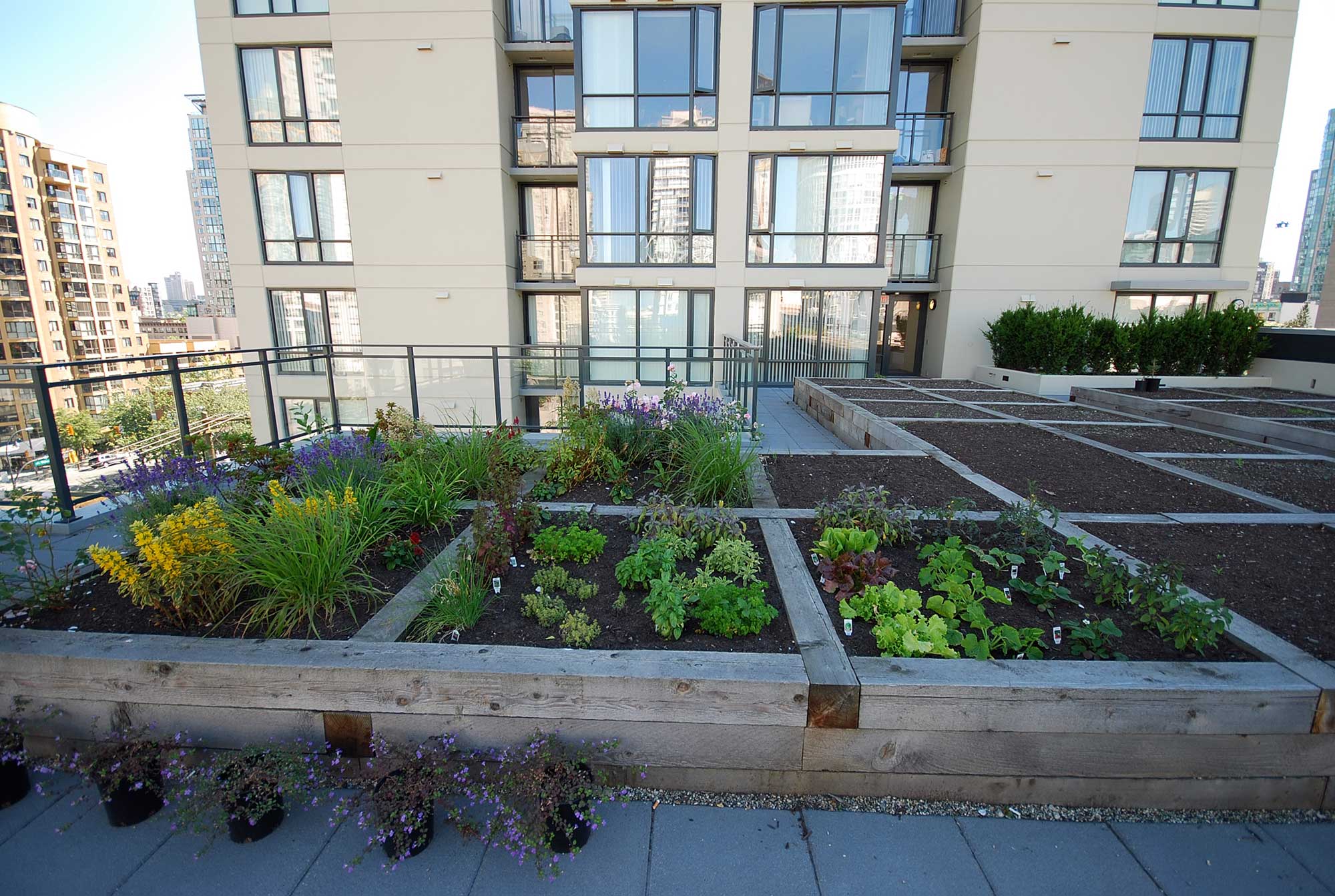The Freesia, a 181-unit high-rise condominium in downtown Vancouver, incorporated garden plots for residents on the seventh-floor podium rooftop. The garden area features 60 wood-frame raised beds, a tool shed, and garden lockers. Herbs, beans and other vegetables are grown here. The Freesia’s rooftop is farmed by City Farm Boy, a company that promotes urban agriculture. Using underused private gardens, to produce vegetables which are shared between garden owners. City Farm Boy sell the produce to farmers’ markets.