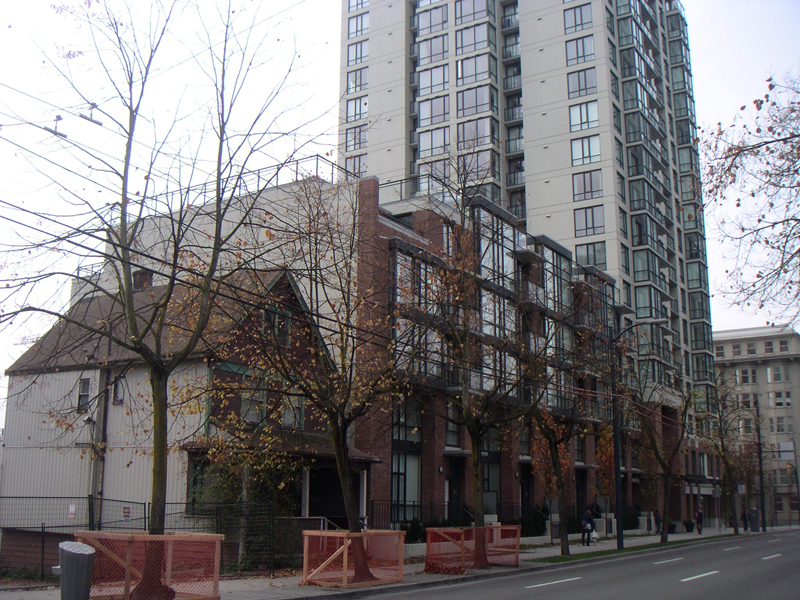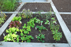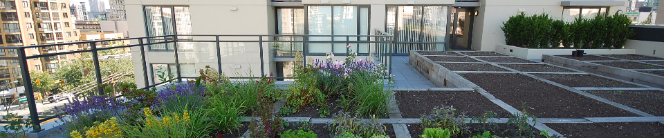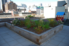 This garden is located on the seventh-floor mezzanine rooftop of the Freesia, a 181-unit highrise condominium in downtown Vancouver, the first to incorporate garden plots for residents. The garden area features 60 wood-frame raised beds, a tool shed, and garden lockers. Herbs, beans and other vegetables are grown here.