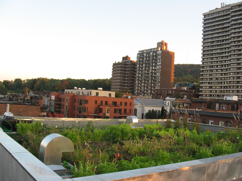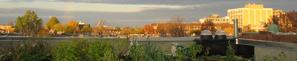 Pour ce projet, la parcelle entièrement minéralisée a subi maintes modifications pour la verdir et ainsi augmenter sa capacité à retenir l’eau de pluie. Les infrastructures montréalaises évacuant l’eau de pluie par le réseau des égouts, il importait ici de favoriser la récupération des précipitations à même le site. La construction d’un toit vert intensif avec l’ajout de 12 pouces de terre permet la rétention quasi-complète de l’eau de pluie sur une base annuelle.