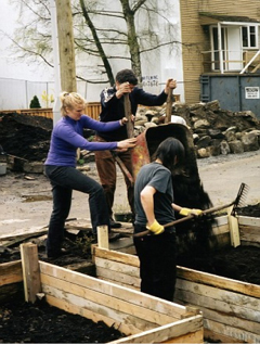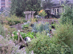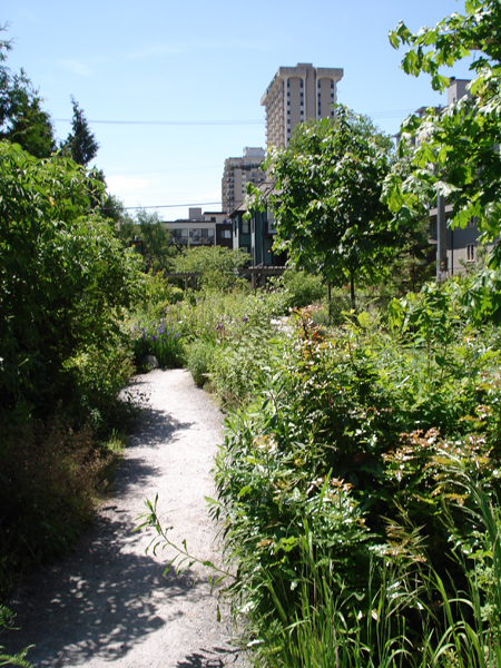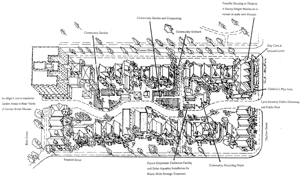 The Mole Hill Community Housing Project, located around a laneway between Comox, Pendrell, Bute and Thurlow streets in downtown Vancouver was completed in 2003. The project is noteworthy not only for the retention and restoration of 26 heritage buildings, creation of 170 units of affordable housing, and a child-care precinct, but it also incorporates significant sustainable design features. The pedestrian-priority open space design features a greenway in the lane behind the houses, planted entirely with food plants. This “living lane” provides a pedestrian friendly space for the surrounding community to gather.